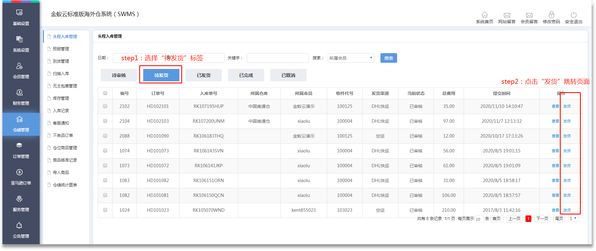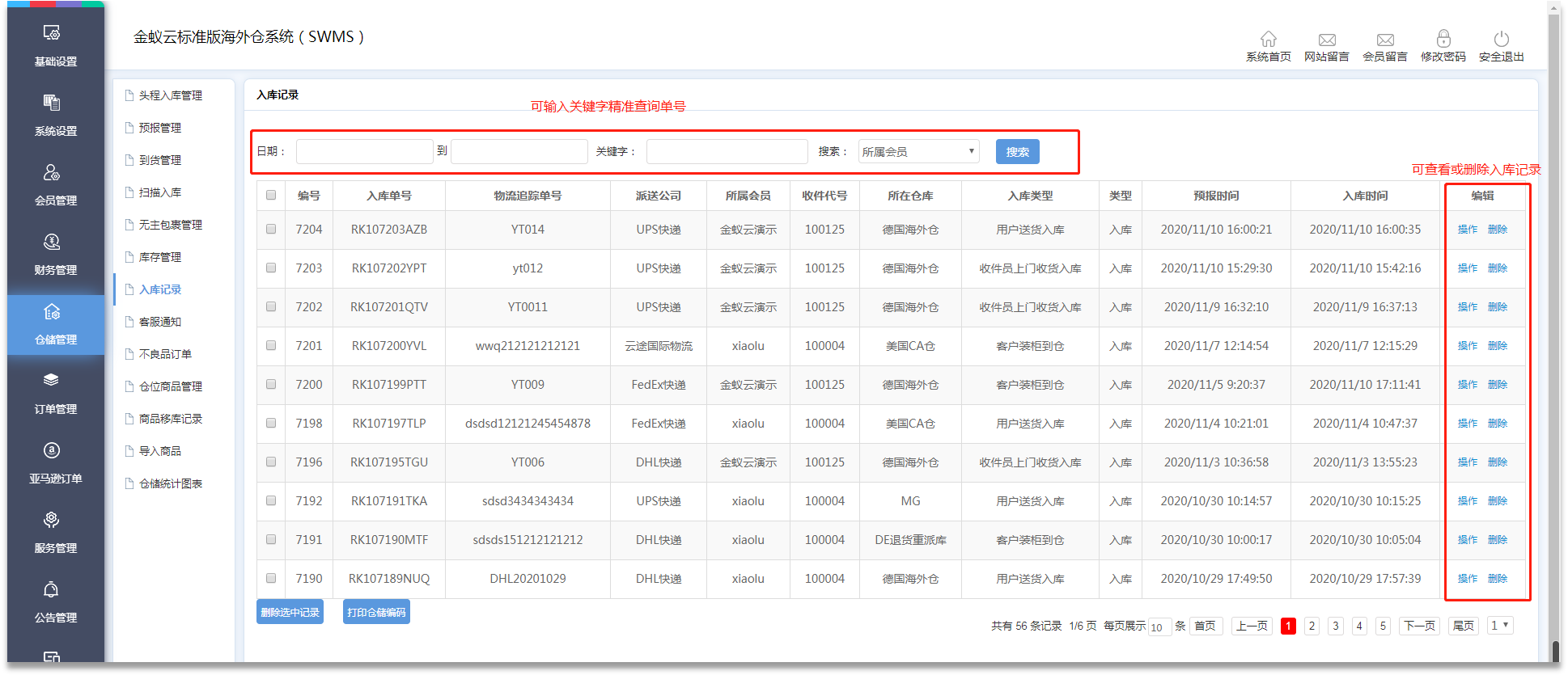 ·訂單處理后,將自動進(jìn)入相應(yīng)狀態(tài),管理員可在【倉儲管理】-【頭程入庫管理】頁面通過【搜索】,或者在【倉儲管理】-【入庫記錄】頁面查詢并跟進(jìn)訂單。