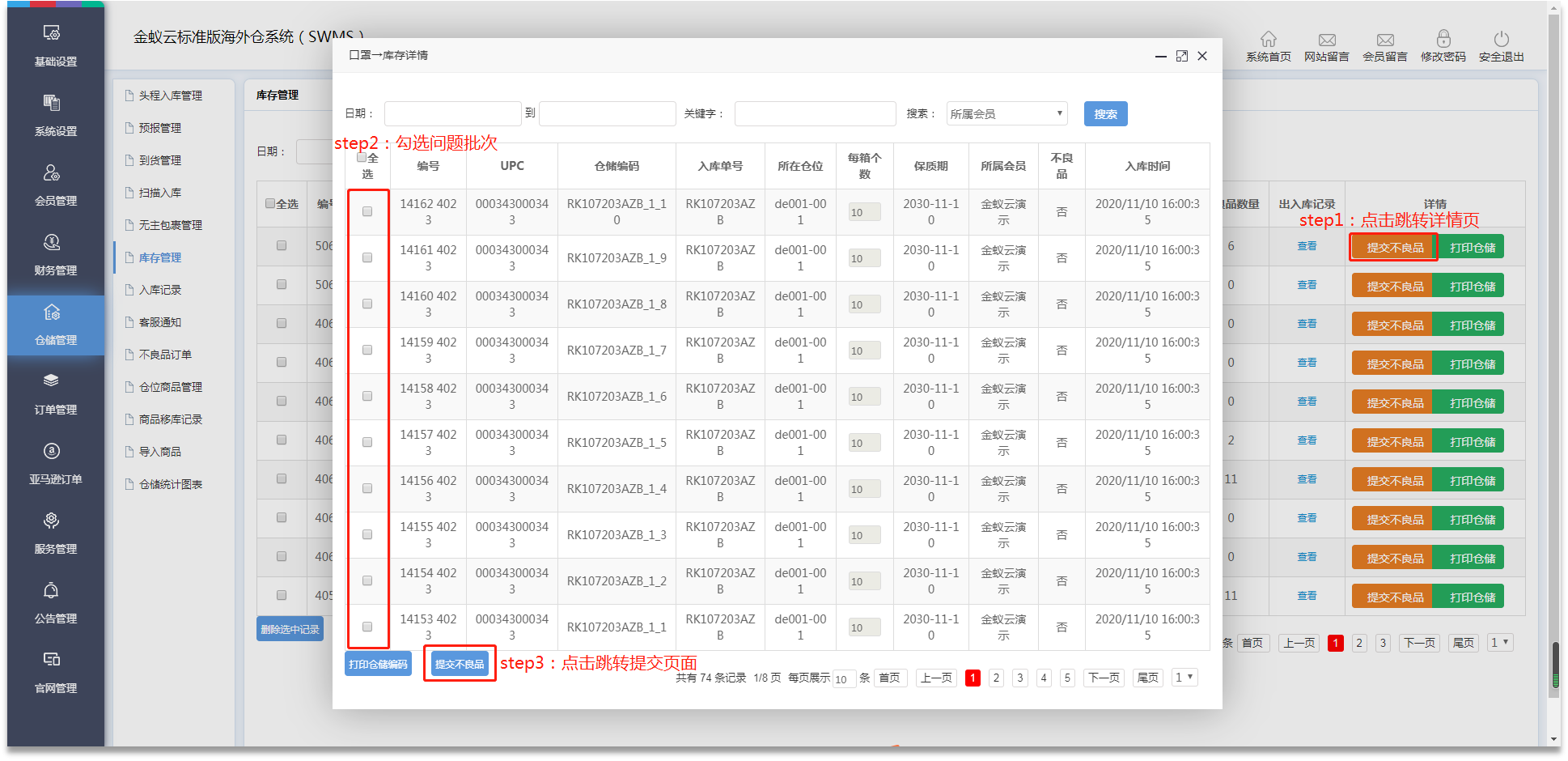 ·如發(fā)現(xiàn)不良品,管理員需在【倉儲管理】-【庫存管理】提交不良品訂單。