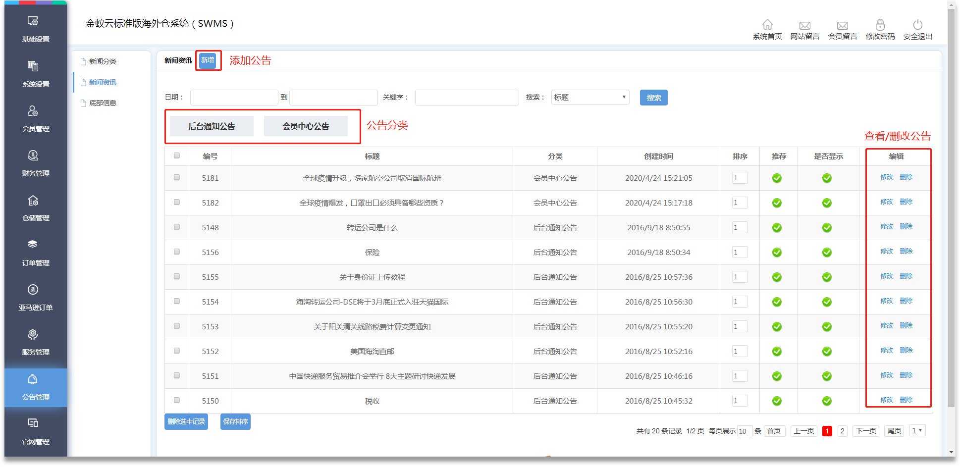 海外倉系統(tǒng)標準版(管理端)操作說明:公告及官網管理