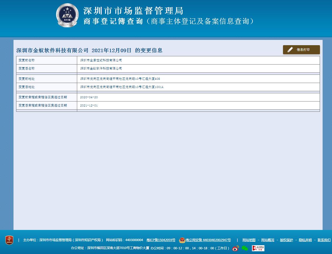我司深圳市全景世紀(jì)科技有限公司因長遠(yuǎn)發(fā)展需要,在2021年12月9日通過工商變更,現(xiàn)公司名稱正式變更為深圳市金蟻軟件科技有限公司。以后各位與我司間的業(yè)務(wù)往來,涉及相關(guān)名稱變更事項(xiàng),煩請協(xié)助辦理相關(guān)變更: