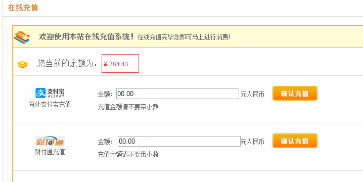 第1步: 登陸會員中心后,在在線充值頁面的 海外支付寶充值的金額里輸入要充的金額, 以下為充值0.12元舉例.