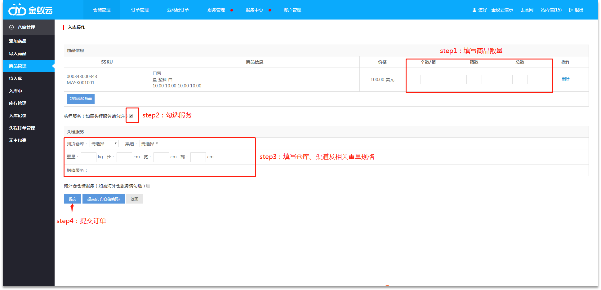 ·跳轉(zhuǎn)【入庫操作】后,填寫相關(guān)發(fā)貨信息,勾選“頭程服務(wù)”,選擇發(fā)貨倉庫、渠道、增值服務(wù),填寫貨物重量、長寬高及點(diǎn)擊【提交】。