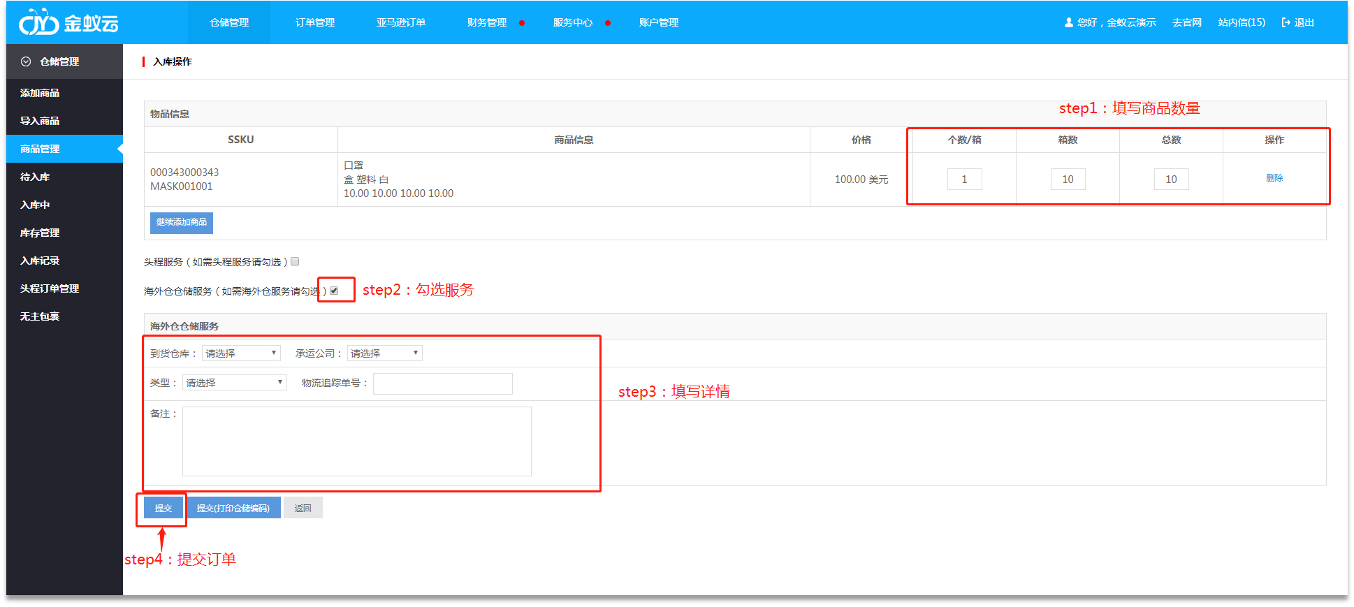 ·跳轉(zhuǎn)【入庫操作】后,填寫商品每箱個(gè)數(shù)、箱數(shù),系統(tǒng)自動(dòng)得出“商品總數(shù)”;勾選“海外倉儲(chǔ)服務(wù)”,填寫選擇倉庫、承運(yùn)物流公司、類型、物流追蹤單號(hào)等。以上資料填寫完畢,即可點(diǎn)擊【提交】。