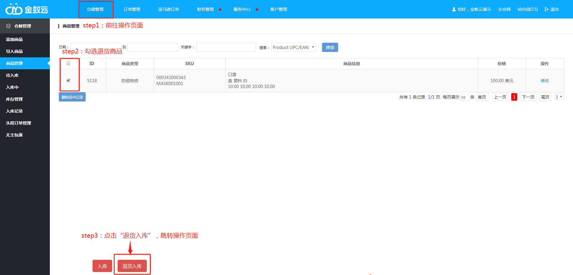 ·當(dāng)客戶有退貨商品需要將商品退貨海外倉(cāng)時(shí),用戶可前往【倉(cāng)儲(chǔ)管理】-【商品管理】申請(qǐng)【退貨入庫(kù)】。