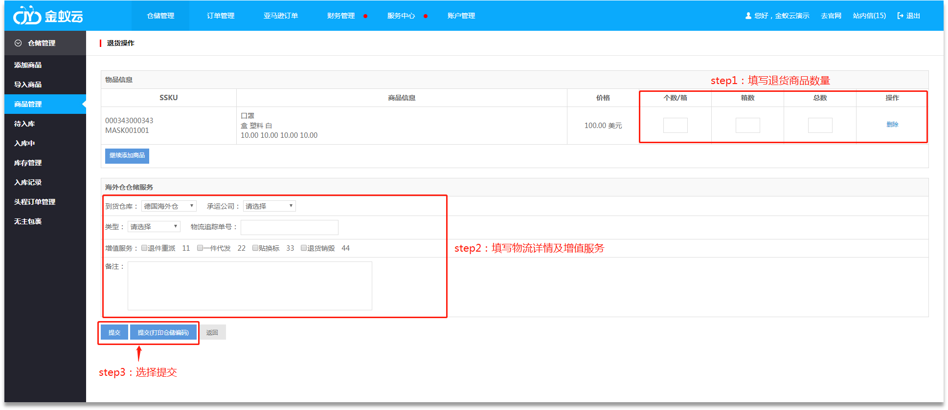 ·跳轉(zhuǎn)【退貨操作】后,填寫(xiě)退貨商品的每箱個(gè)數(shù)、箱數(shù),系統(tǒng)自動(dòng)計(jì)算“商品總數(shù)”;勾選“海外倉(cāng)儲(chǔ)服務(wù)”,填寫(xiě)選擇倉(cāng)庫(kù)、承運(yùn)物流公司、類型、物流追蹤單號(hào)等,填寫(xiě)完畢,即可點(diǎn)擊【提交】/【提交(打印倉(cāng)儲(chǔ)編碼)】。