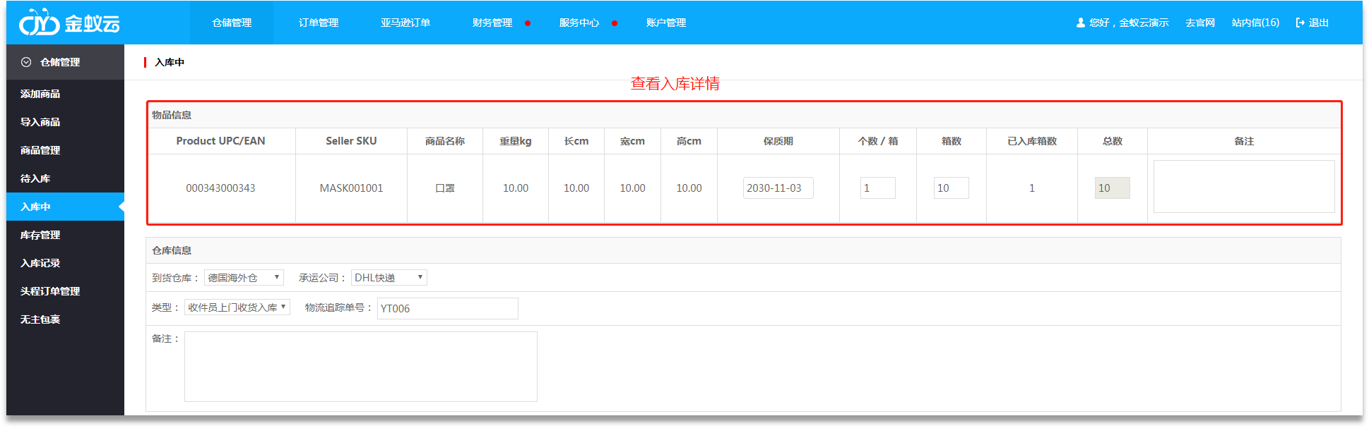 ·用戶查看具體入庫(kù)詳情,可在【倉(cāng)儲(chǔ)管理】-【入庫(kù)中】點(diǎn)擊【查看】,跳轉(zhuǎn)入庫(kù)詳情頁(yè)。