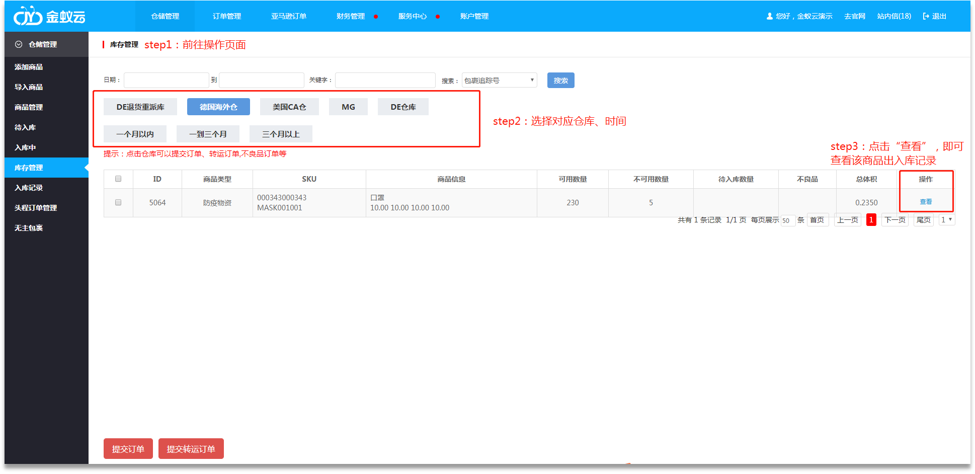 ·前往【倉(cāng)儲(chǔ)管理】-【庫(kù)存管理】,選擇相應(yīng)倉(cāng)庫(kù),即可查詢倉(cāng)庫(kù)內(nèi)商品庫(kù)存數(shù)量,對(duì)應(yīng)商品庫(kù)存狀態(tài)顯示可用數(shù)量、不可用數(shù)量、待入庫(kù)數(shù)量、不良品數(shù)量。