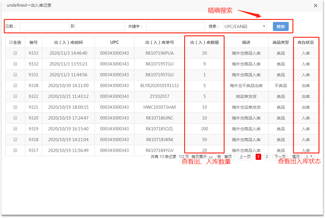·在【倉(cāng)儲(chǔ)管理】-【庫(kù)存管理】選擇商品點(diǎn)擊【查看】,即可查詢?cè)撍x商品出入庫(kù)記錄。