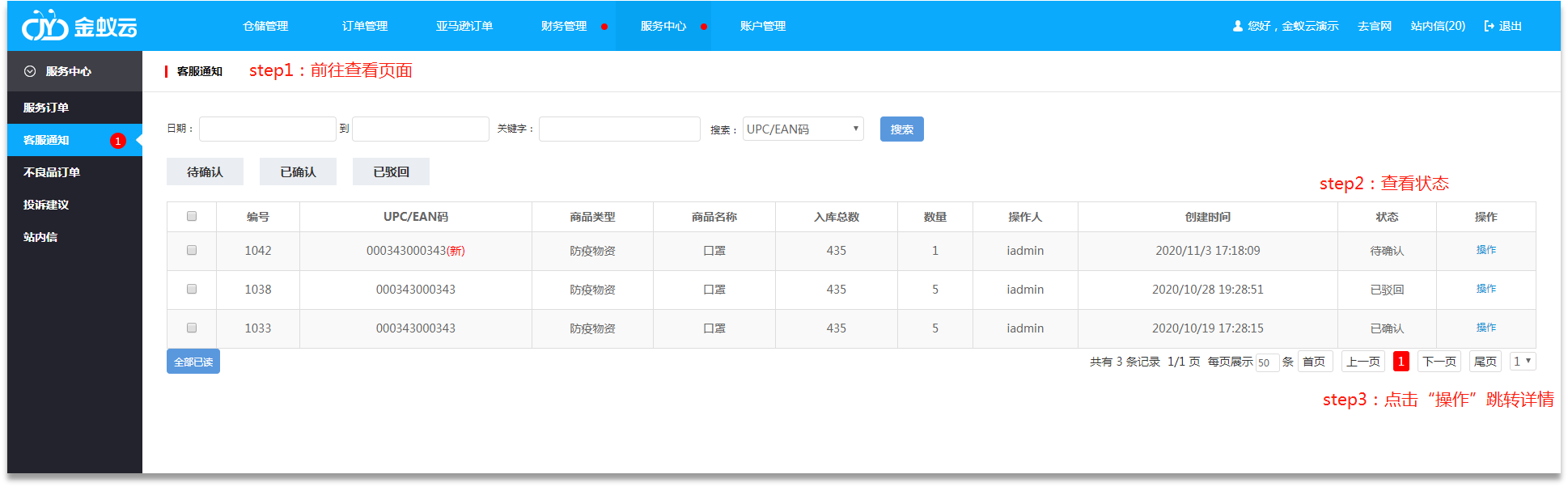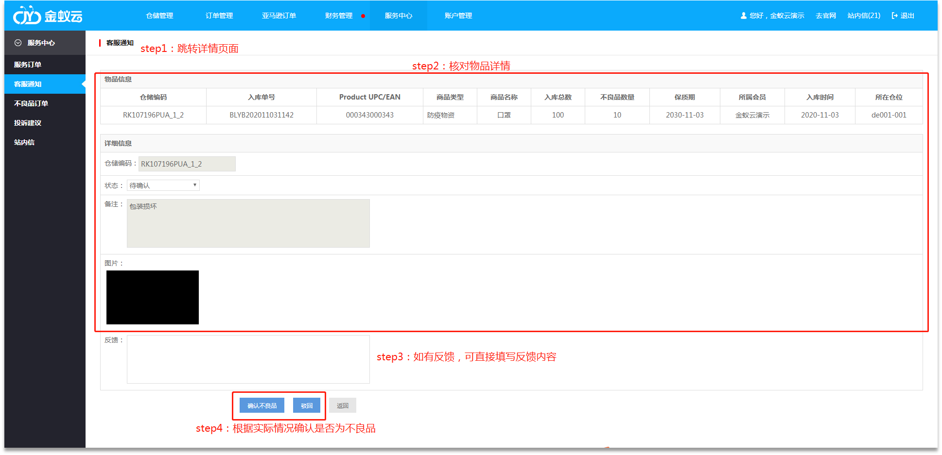 ·當(dāng)庫(kù)存商品發(fā)現(xiàn)不良品,管理員發(fā)出通知信,用戶可前往【服務(wù)中心】-【客服通知】進(jìn)行處理。
