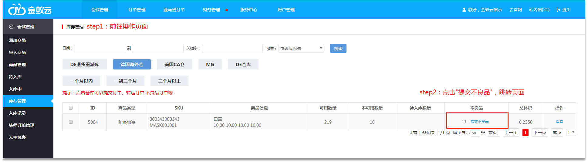 ·用戶點(diǎn)擊【確認(rèn)不良品】后,需前往【倉(cāng)儲(chǔ)管理】-【庫(kù)存管理】頁(yè)面提交不良品訂單。