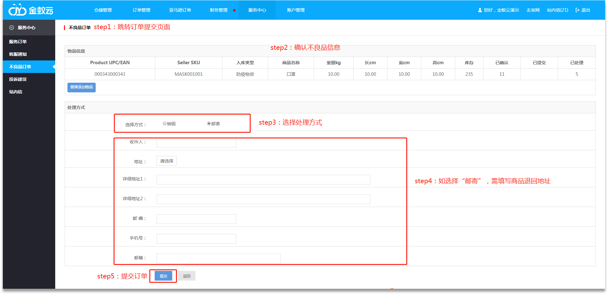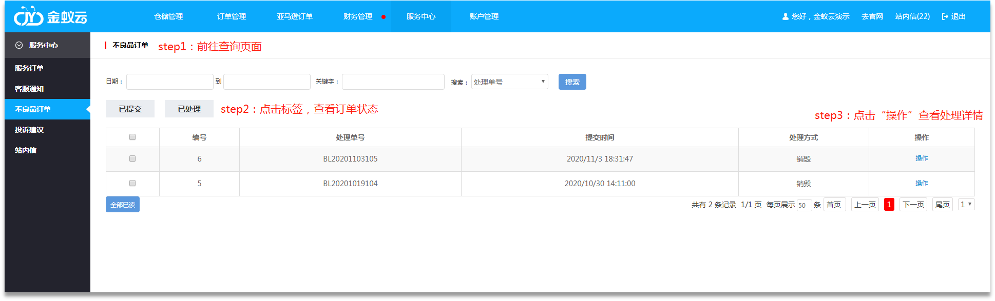 ·用戶提交不良品訂單后,可在【服務(wù)中心】-【不良品訂單】查詢、跟進(jìn),處理費(fèi)用將在后臺(tái)自動(dòng)扣除。