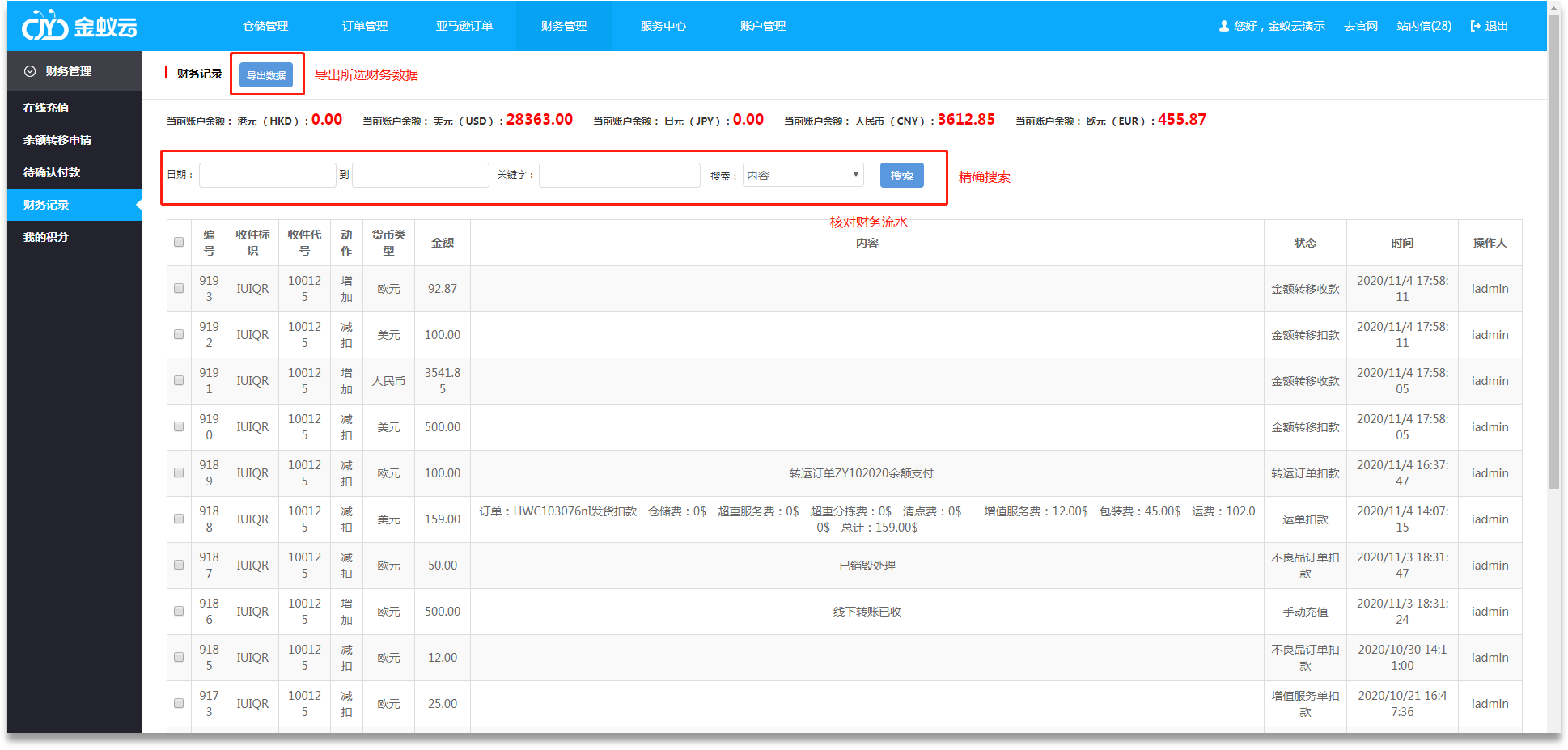 ·本系統(tǒng)嚴(yán)格記錄每一筆財(cái)務(wù)流水,用戶(hù)可前往【財(cái)務(wù)管理】-【財(cái)務(wù)記錄】中查詢(xún)并導(dǎo)出財(cái)務(wù)數(shù)據(jù)。