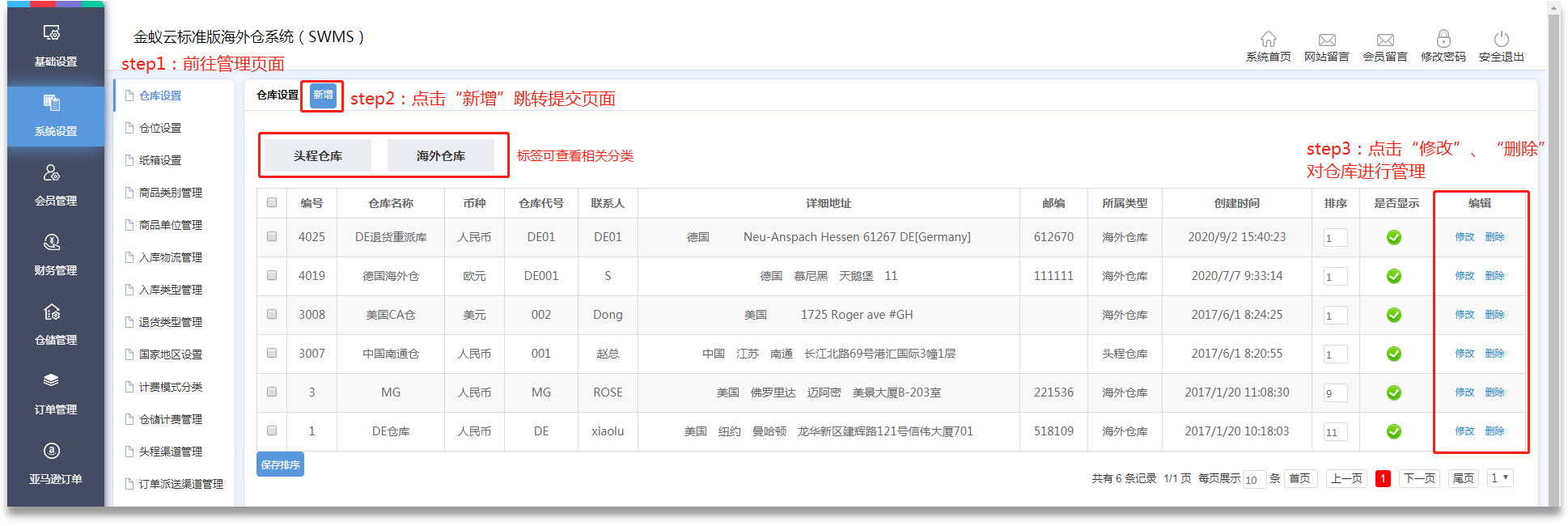 ·管理員可在【系統(tǒng)設(shè)置】-【倉庫設(shè)置】進(jìn)行倉庫的數(shù)字化管理,在【新增】時,需注意區(qū)分【頭程倉庫】和【海外倉庫】。