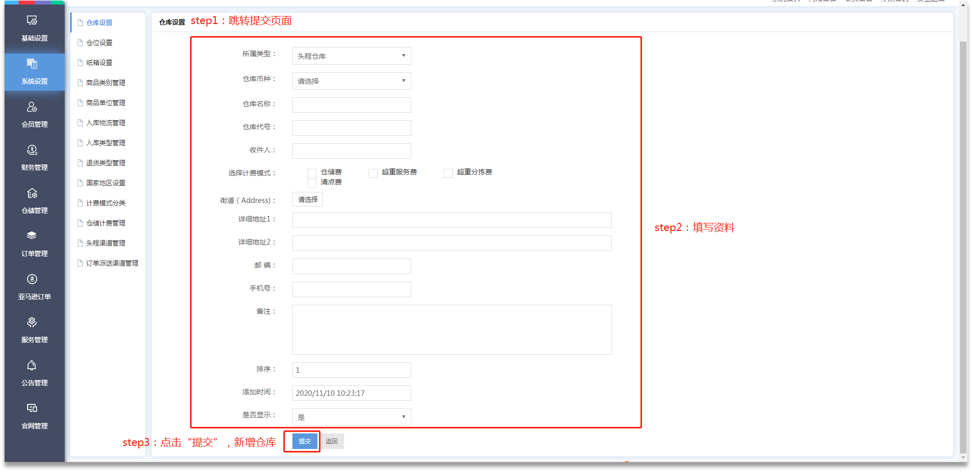 ·管理員可在【系統(tǒng)設(shè)置】-【紙箱設(shè)置】、【計費(fèi)模式分類】、【倉儲計費(fèi)管理】進(jìn)行費(fèi)用設(shè)置;在【商品類別管理】、【商品單位管理】進(jìn)行商品設(shè)置;在【入庫類型管理】、【退貨類型管理】進(jìn)行入庫類型設(shè)置;在【國家地區(qū)設(shè)置】進(jìn)行地址設(shè)置及導(dǎo)入。