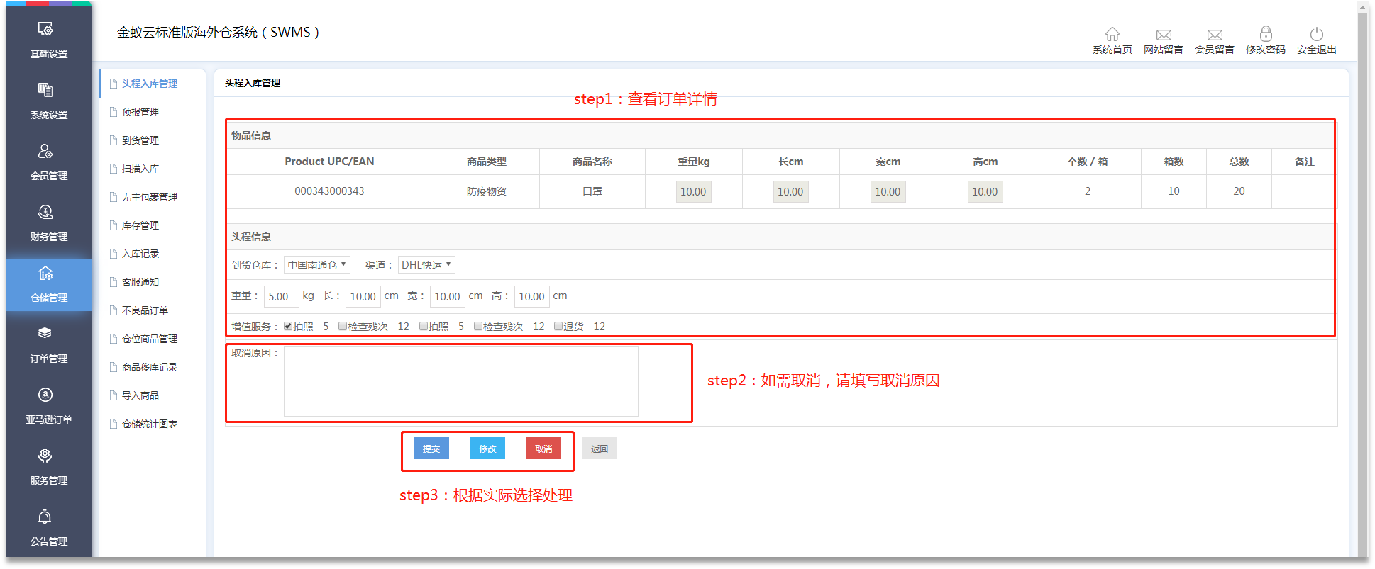 ·會員提交頭程訂單后,需在【倉儲管理】-【頭程入庫管理】進(jìn)行處理,管理員在待審核訂單處理可選擇提交/修改/取消。