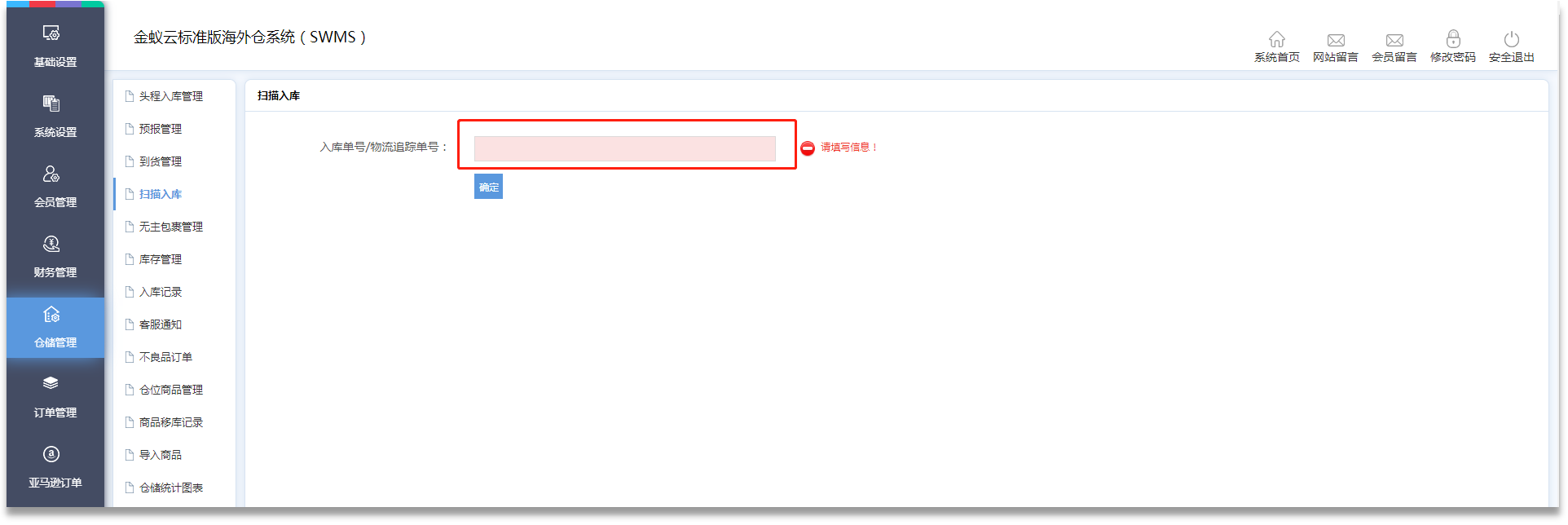 ·貨物到達(dá)倉庫后,管理員需前往【倉儲管理】-【掃描入庫】填入單號,跳轉(zhuǎn)【倉儲管理】-【預(yù)報管理】頁面完成入庫操作。