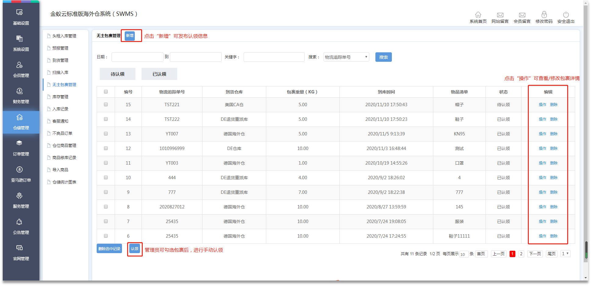 ·如存在無法辨別歸屬的物品,可在【倉儲管理】-【無主包裹管理】發(fā)布認領(lǐng)信息,會員可自行核對認領(lǐng);在查明來源后,管理員也可手動操作認領(lǐng)。