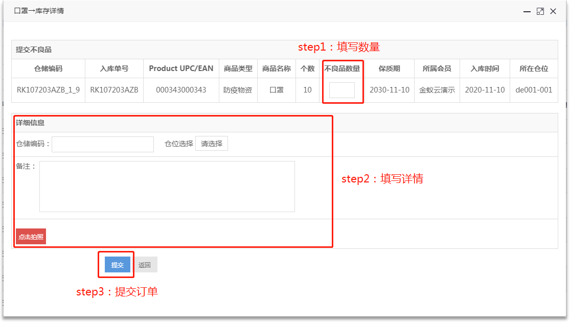 ·如發(fā)現(xiàn)不良品,管理員需在【倉儲管理】-【庫存管理】提交不良品訂單。