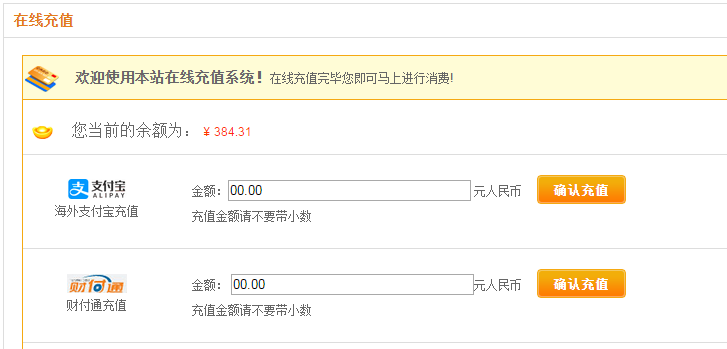 第1步: 登陸會員中心后,在在線充值頁面的 海外支付寶充值的金額里輸入要充的金額, 以下為充值0.12元舉例.
